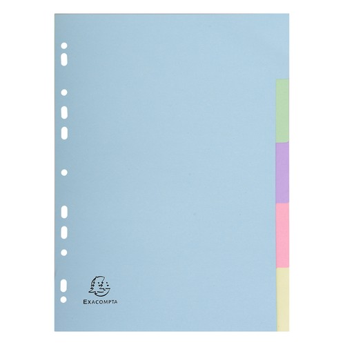 These environmentally friendly Exacompta A4 dividers are made from 100% recycled 170gsm pastel card. This 5-part set comes in attractive pastel colours and is multipunched for filing in standard ring binders and lever arch files.