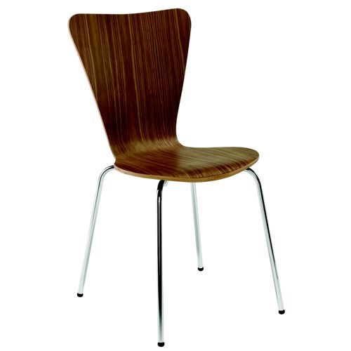 This stylish and elegant wooden chair with chrome legs is the perfect contemporary addition to any office break area or canteen. A smooth, moulded seat offers great stability, as well as comfort for up to 5 hours. The chrome frame offers fantastic support and durability. You can swiftly and easily stack up to 4 chairs on top of each other to create additional space and store the chairs away quickly and efficiently. This set contains 4 chairs with a walnut finish.
