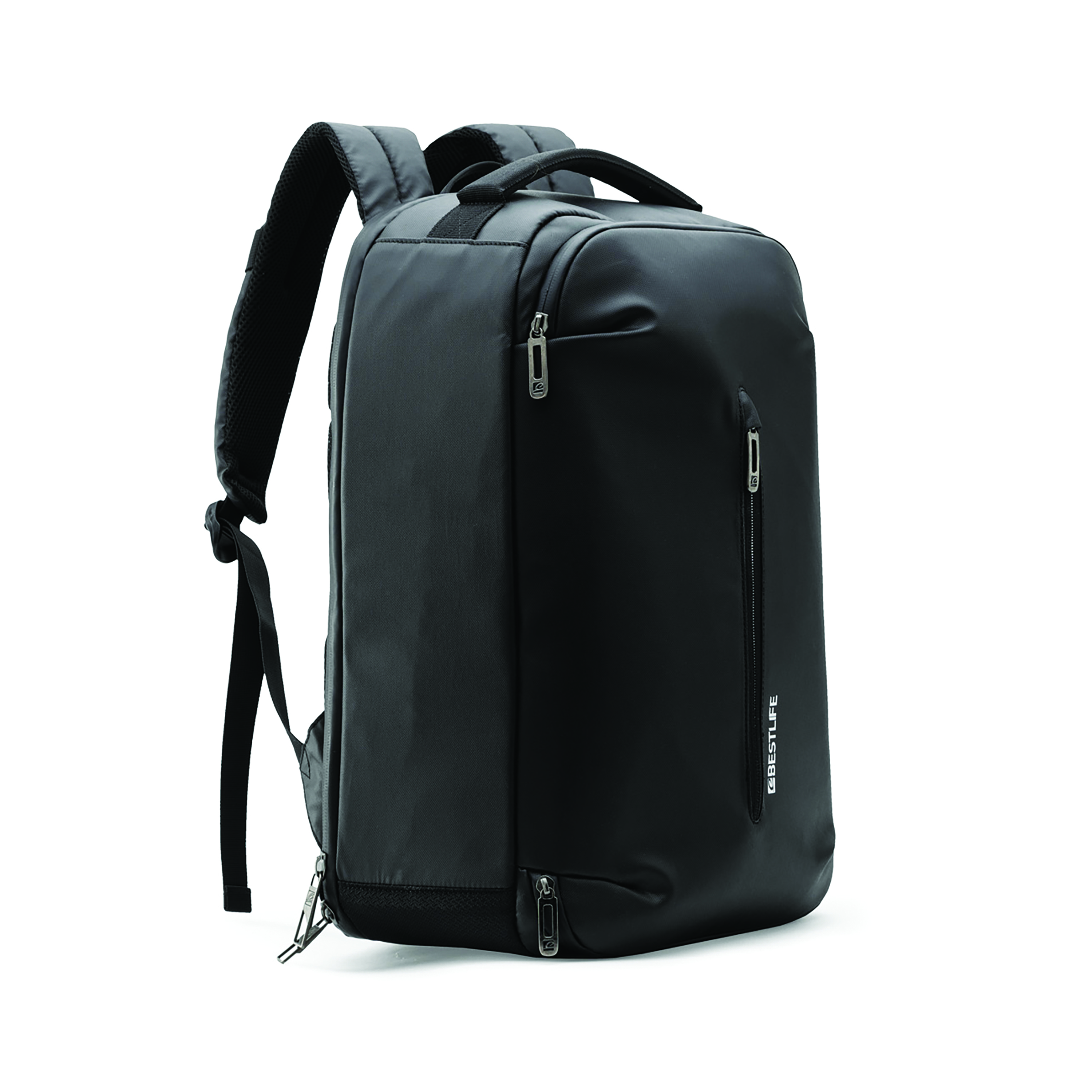 The BestLife Oden X Laptop Backpack with padded compartments for tablets and laptops up to 15.6 inches. It has a retractable 3-in-1 connector with USB plug Type C and Lightning. Featuring a large anti-theft main compartment, with dividers for accessories, 3 large front pockets, waterproof zippers and a hidden pocket. The backpack is made from anti-microbial and waterproof material with ergonomic shoulder pads and back, padded with breathable mesh for comfortable transportation. Three large front pockets. Opening up to 180.