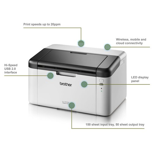 The new compact HL-1210W combines print speeds of up to 20ppm and a built in wireless network, which enables you to print files straight from your smartphone or tablet using the Brother iPrint&Scan app, making this the ideal printer for home and small office use.