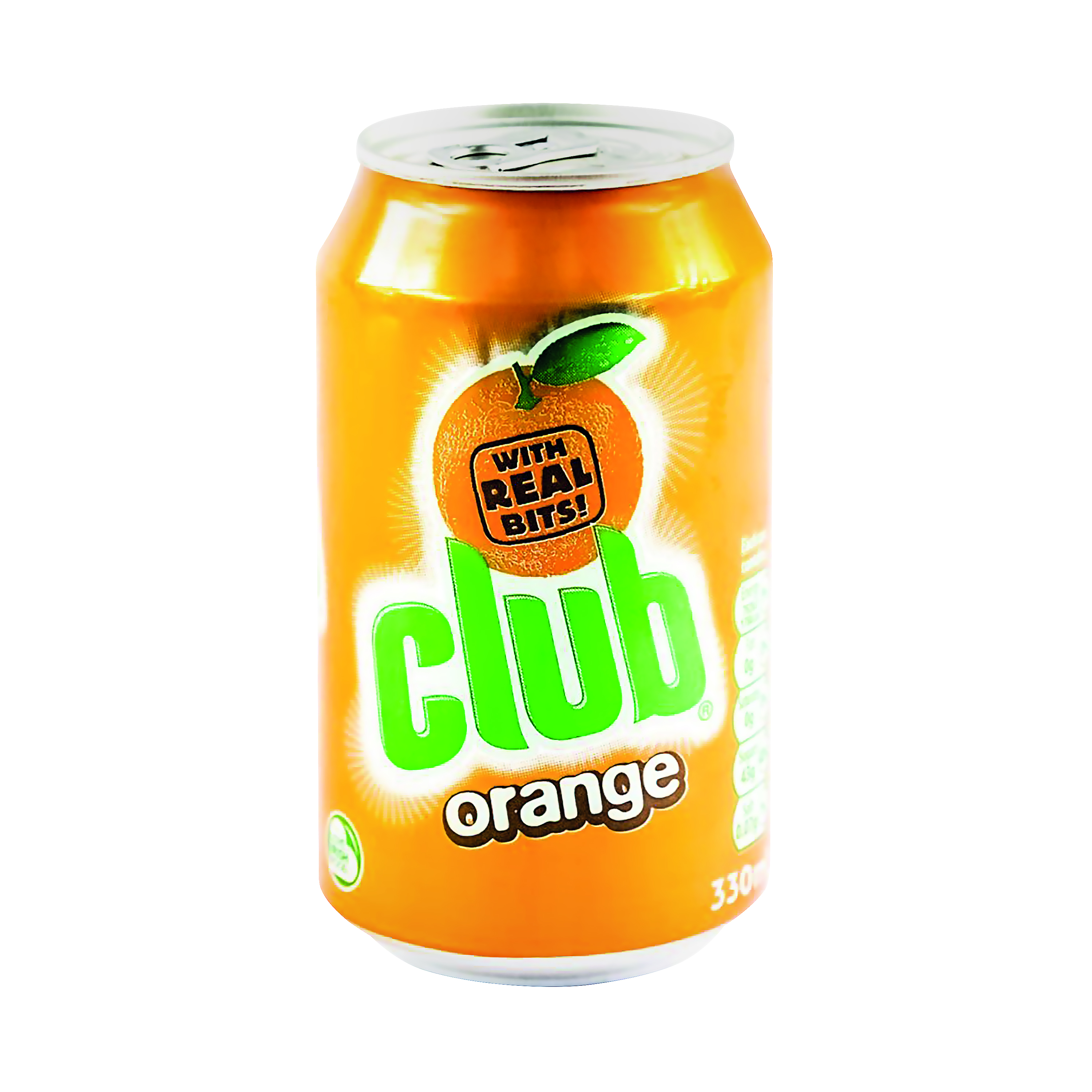 Club orange soft drink, made with carbonated water, sugar, orange fruit from concentrate with real orange bits. 330ml can. Supplied in a pack of 24 cans.