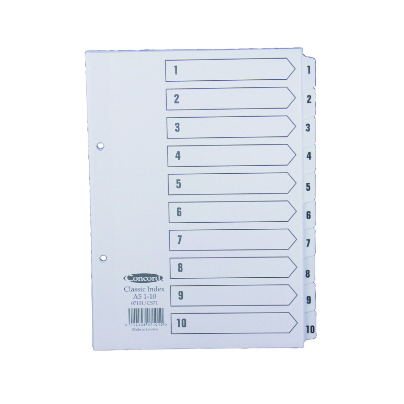 This Concord 1-10 Classic Index Divider is ideal for use in lever arch files and ring binders. Sized to A5 and hole punched, they offer you an easy way to archive and index your files and documents. With a pre-printed numerical indexing system and tabs numbered 1-10, it is easy to organise files for fast retrieval. Transparent Mylar reinforced tabs and punched holes help ensure long-lasting, tear-resistant durability.
