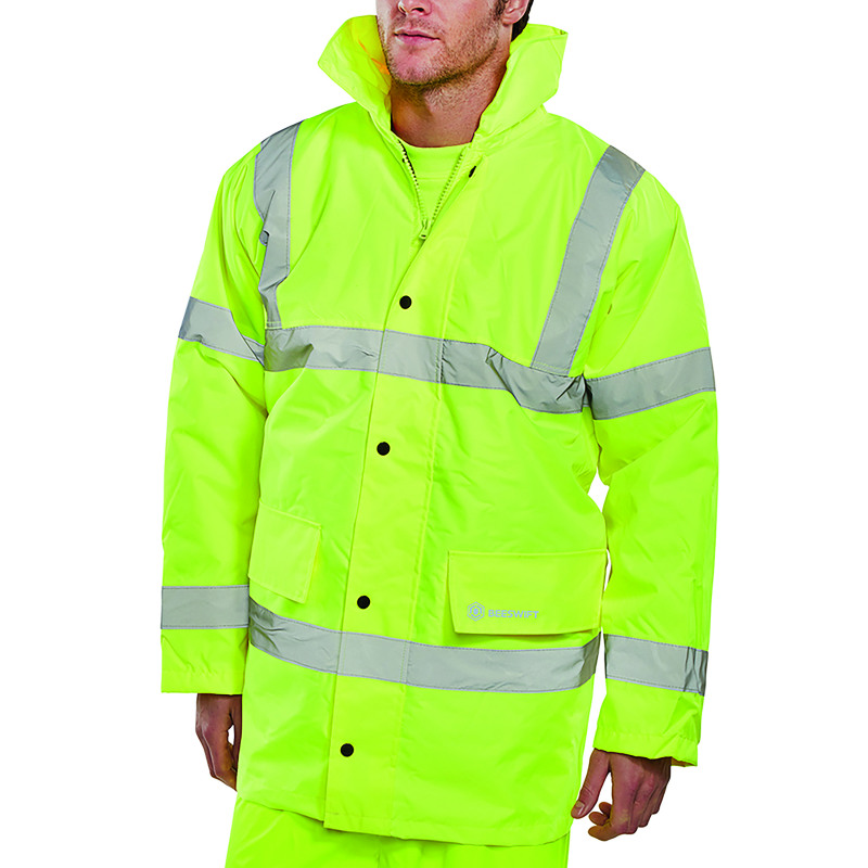 Beeswift Constructor High Visibility Jacket is made from PU coated polyester with a quilted lining with heavy weight (160gsm) polyester filling. The jacket has a concealed hood, two-way heavy duty zip front with storm flap and security pocket. It also features 2 lower pockets with flaps, inside breast pocket, knitted storm cuffs, internal Wicking strip, fully taped seams and reflective material. Conforms to EN ISO 20471 Class 3 High Visibility. Conforms to EN 343 Class 3 Water Penetration Class 1 Air Permeability.