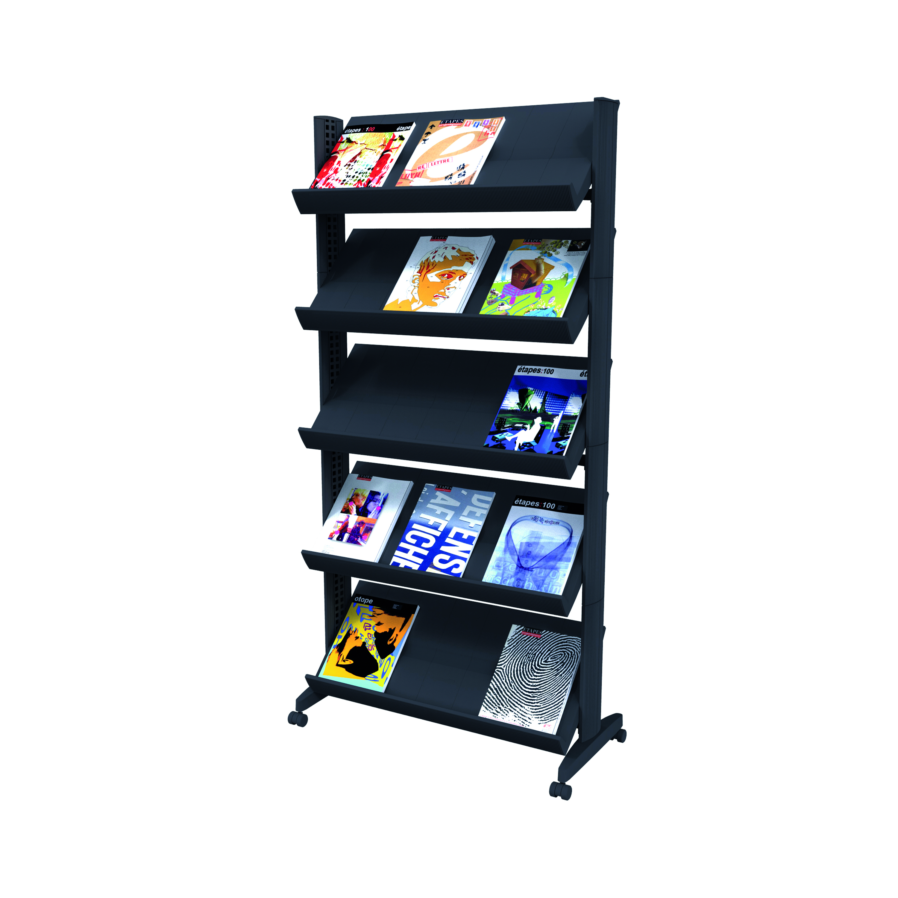 Great for conferences, receptions, waiting rooms and more, the Fast Paper Mobile Literature Display lets you display a wide range of magazines, catalogues, journals and more for your visitors. This model features five wide shelves for arranging an array of literature up to A4 size. The shelves themselves can be adjusted in 20mm increments and from 45 to 75 degrees, letting you customise your display. The whole display sits on four castors for easy mobility and comes in a sleek black finish.