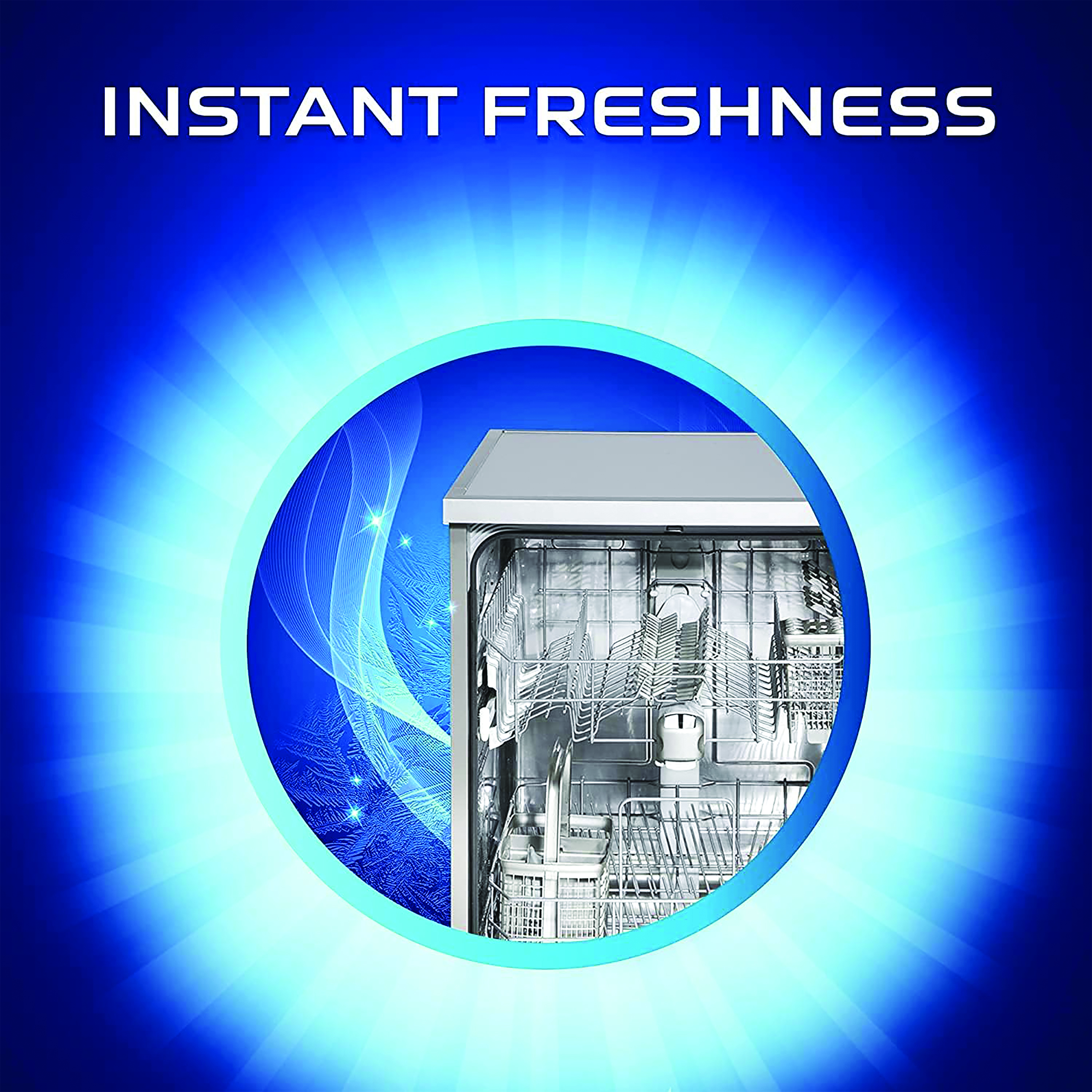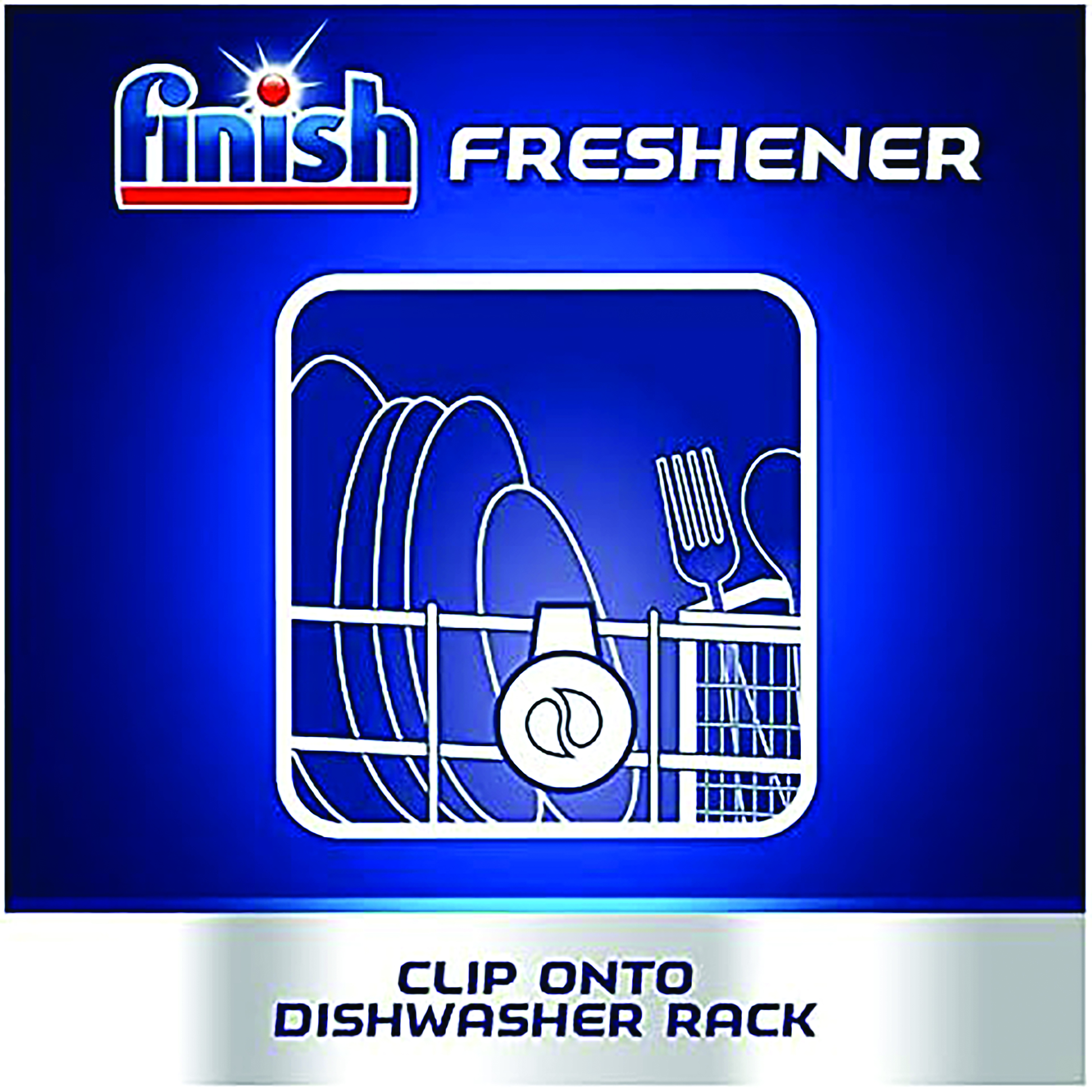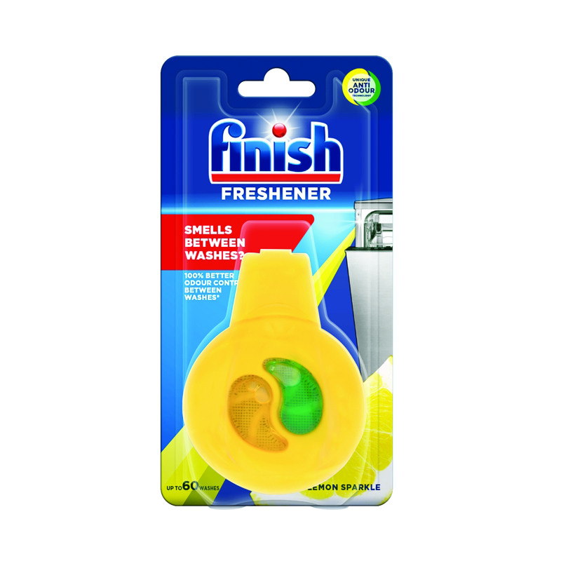 Between washes, residues might lead to malodour developing in the dishwasher. This Finish freshener has a unique Scent Control technology designed to give a refreshing clean, fresh scent every time the dishwasher is opened, helping to avoid any fragrance transfer on dishes during the wash. Simply clip the freshener onto a rack or hang it from the upper rack of the dishwasher, without it blocking the spray arms. Once the liquid inside disappears (approximately 60 washes), replace the whole gadget.