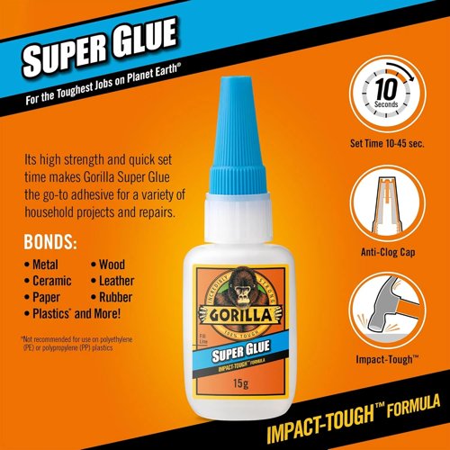 Gorilla Super Glue, 15g – All Purpose, Impact Tough & Fast Setting with Anti-Clog Cap Ideal for Metal, Ceramics, Leather & More