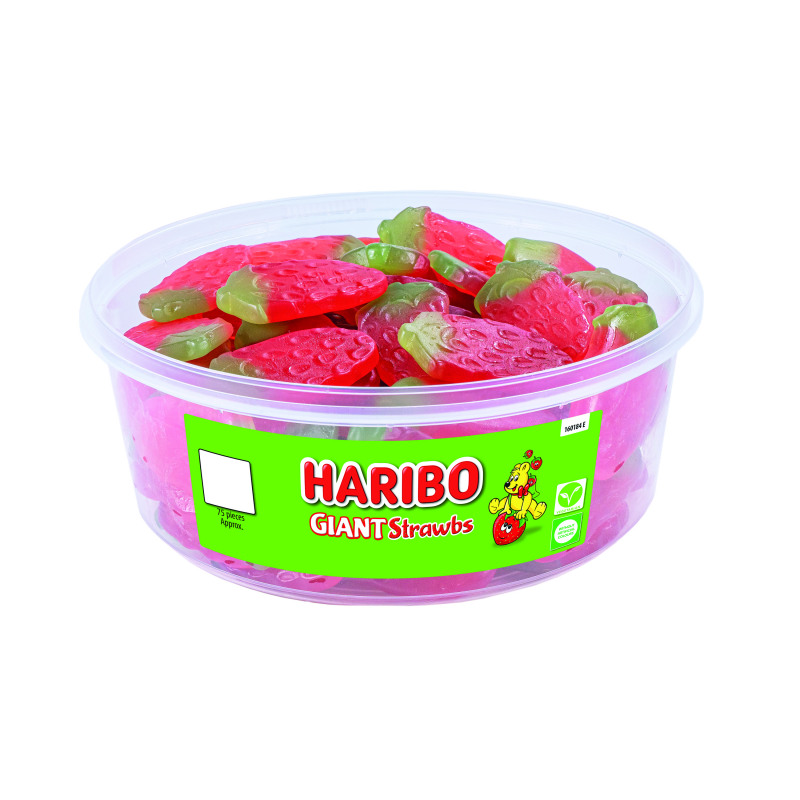 Share some fun and tasty snacks with this tub of Haribo Giant Strawbs. Giant in size and in flavour, these strawberry shaped sweets taste of delicious strawberry with a chewy texture. Suitable for vegetarians and a firm family favourite. This large tub contains approximately 825g Giant Strawbs, ideal for special occasions, celebrations and more.