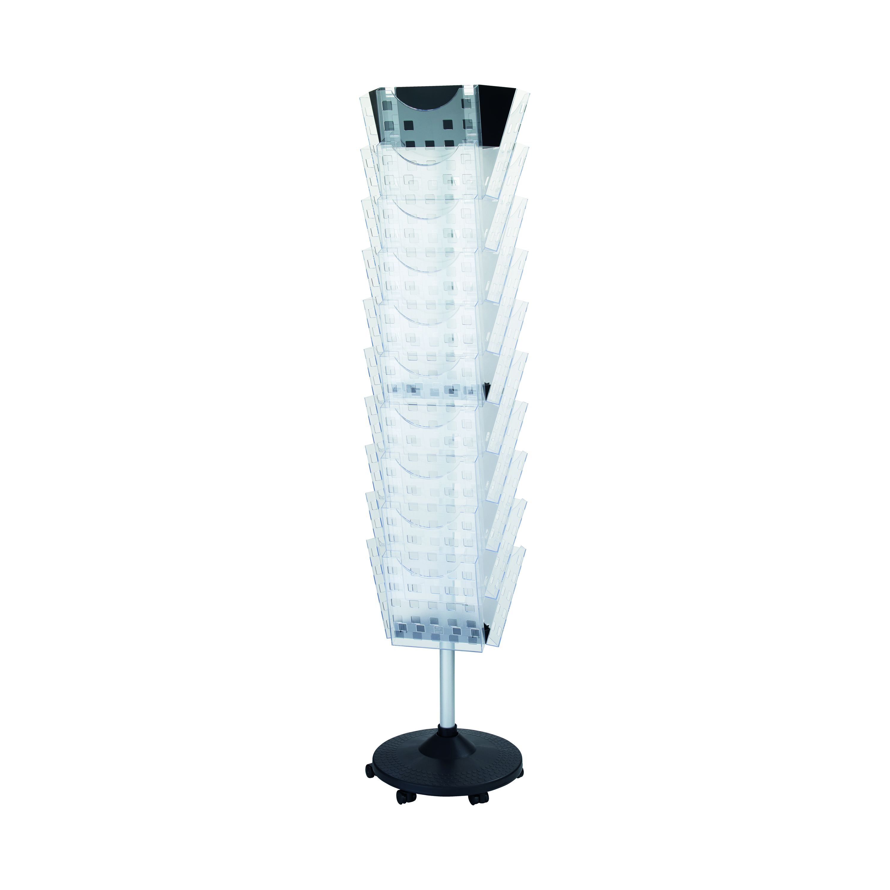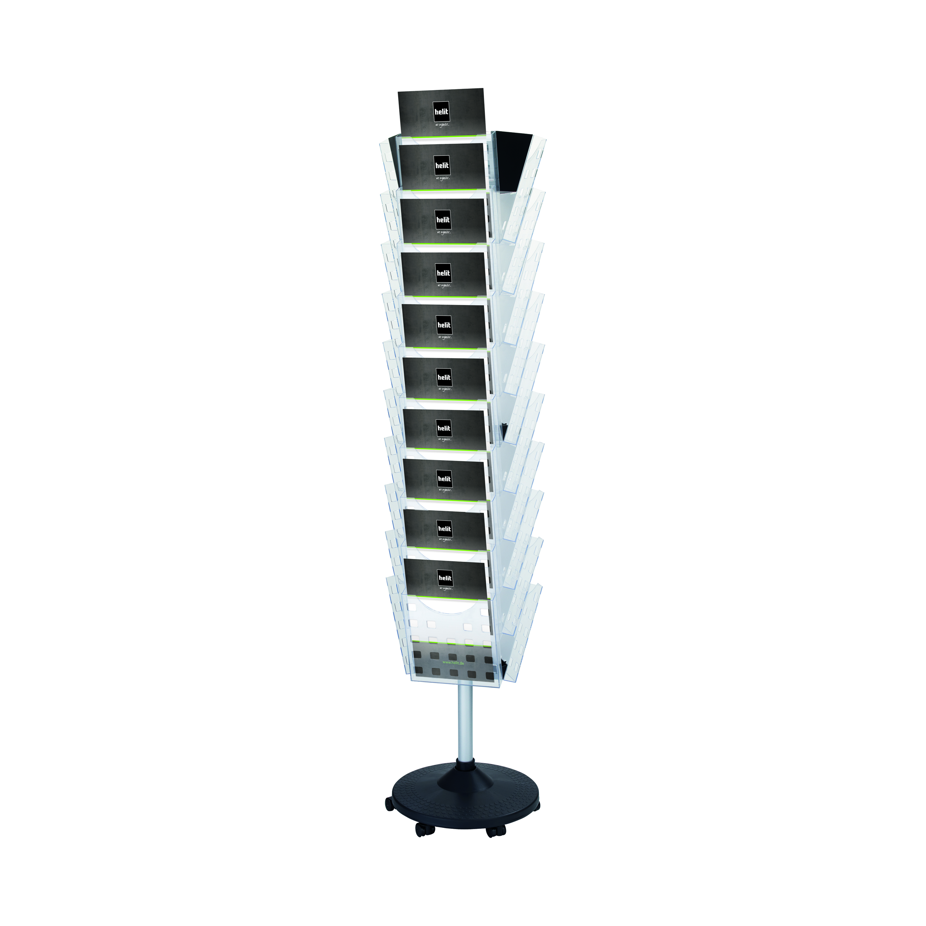 Perfect for use with magazines, literature and brochures, the Helit Grid floor stand is mobile and also rotates for easy access to documentation. Featuring thirty clear pockets for A4 literature and magazines at a glance. Manufactured from a powder coated, steel pole and durable, clear, polystyrene pockets. Sitting on six castors, the display can be moved around to the desired area with ease.