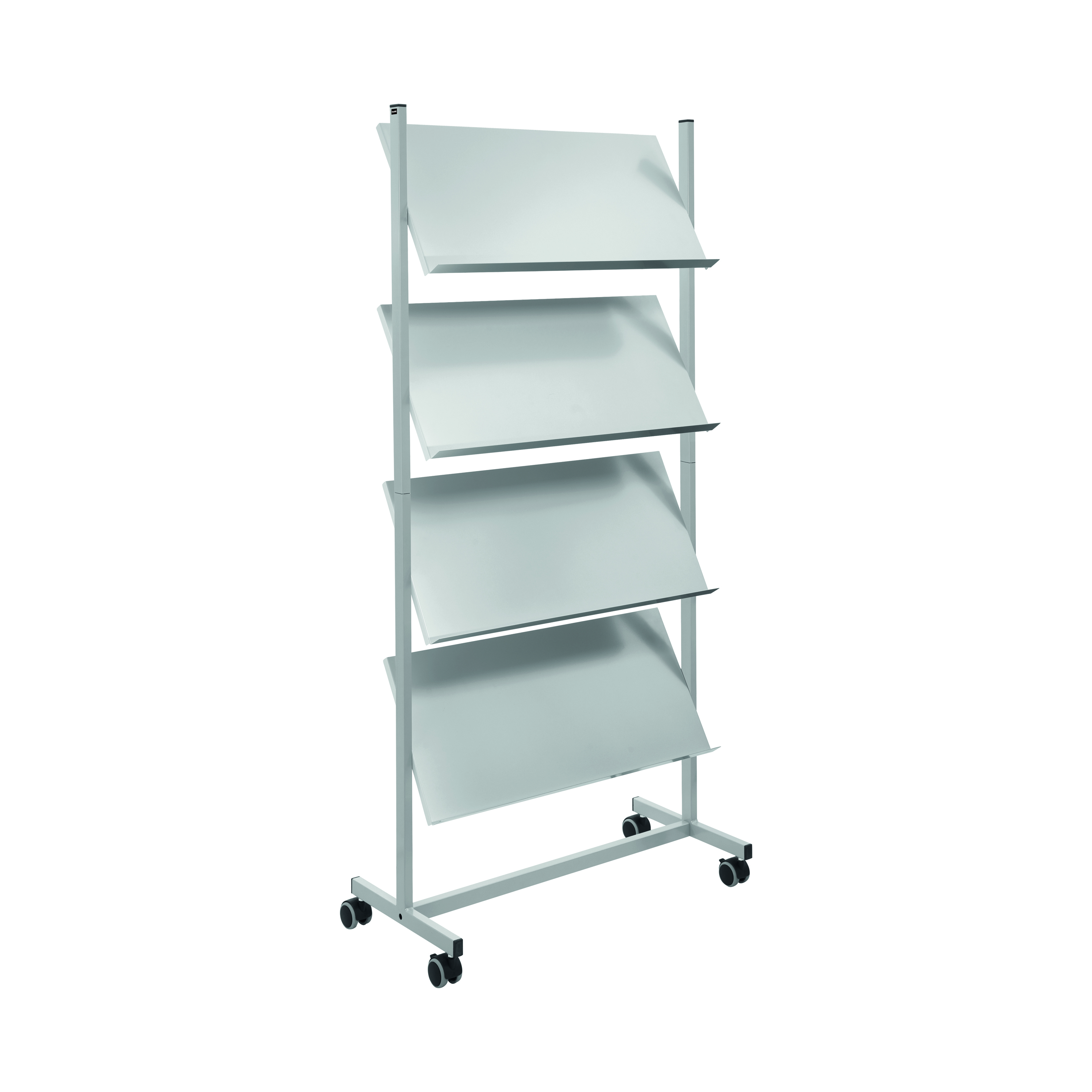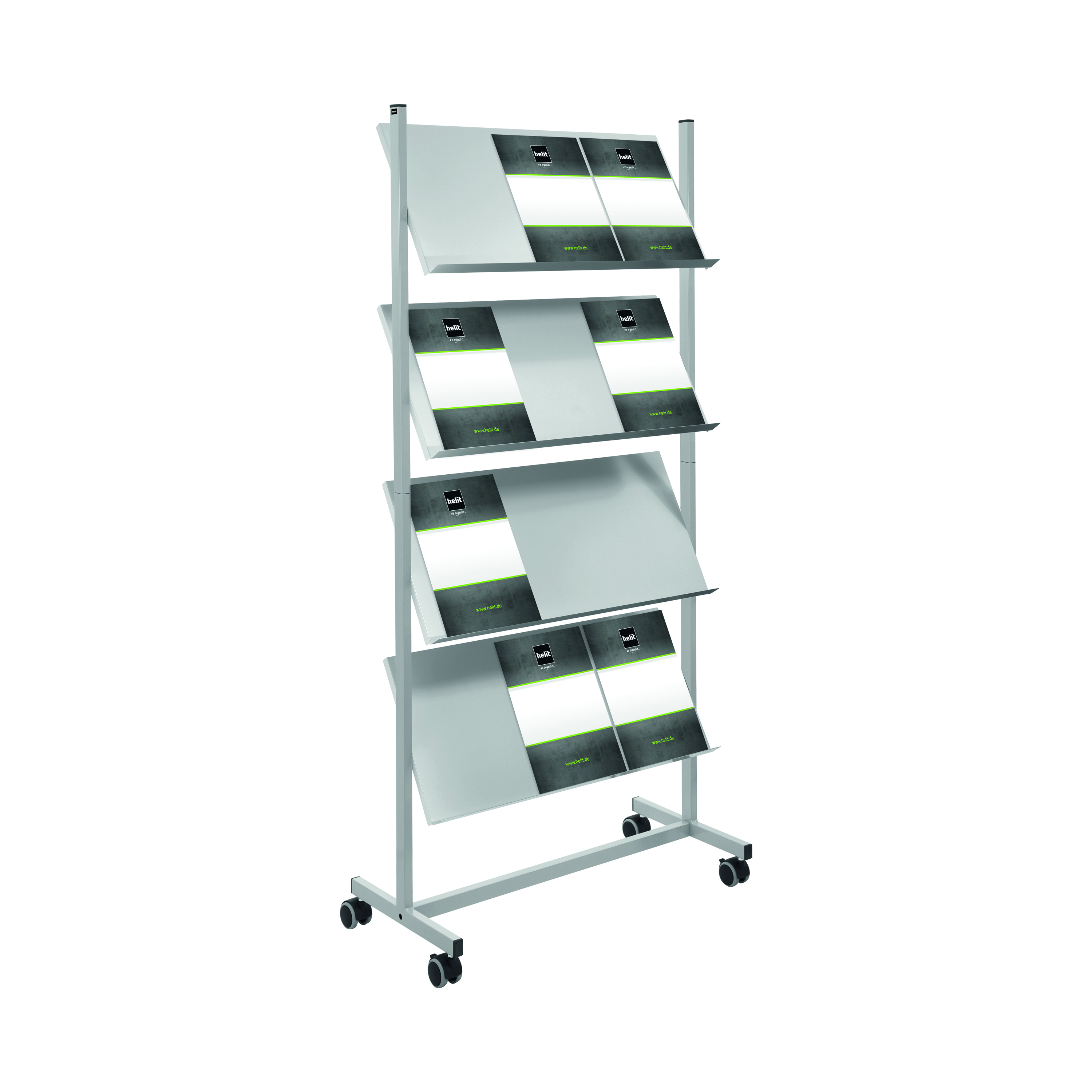 Perfect for use with magazines, literature and brochures, the wide Helit Rolling floor stand is mobile for easy access to documentation, featuring space for up to twelve A4 magazines and leaflets at a glance. Manufactured from a powder coated, steel, it sits on four castors, two of which lock, to enable the display to be moved around to the desired area with ease and locked into place.