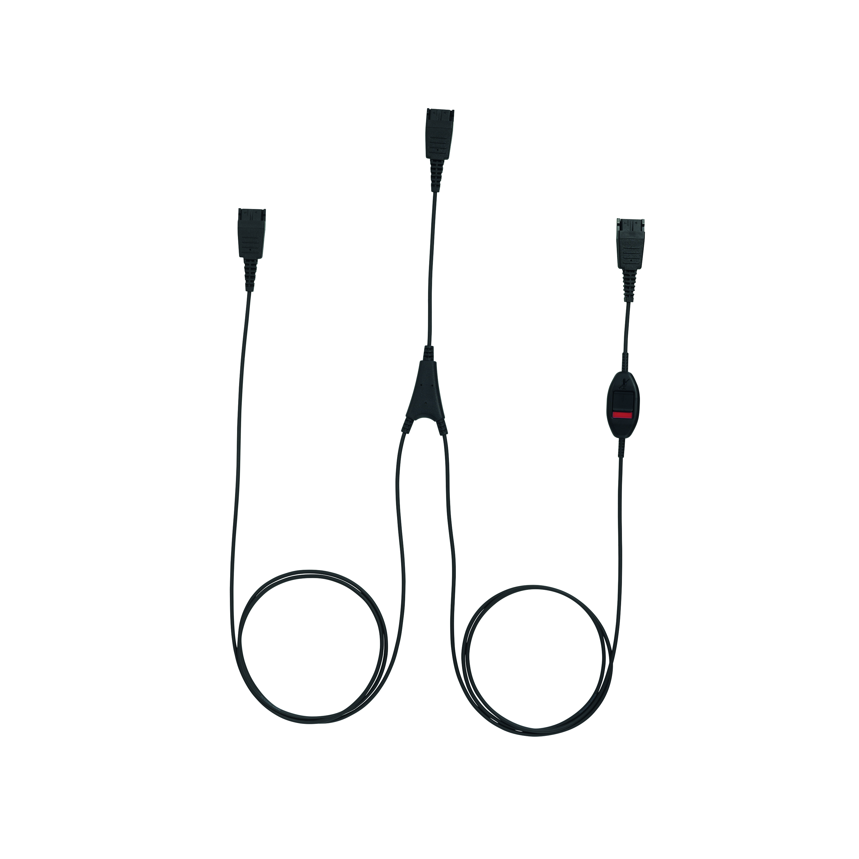 This cord enables two Jabra Quick Disconnect (QD) headsets to connect to one bottom cord for supervision purposes. One side of the cord can either stay muted or participate in the conversation using the switch.