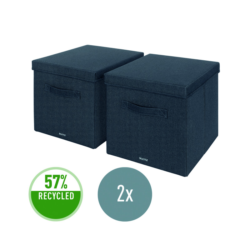 Make yourself at home wherever your day takes you with the Fabric Storage Range from Leitz. With it's minimalist design and inviting matt grey velvet finish, you can stay organised while adding style to your home and workspaces. Leitz Fabric Storage Boxes with lid are the perfect size to be used in standard cube storage units such as the Ikea Kallax Range. The large capacity gives plenty of storage for paperwork, lever arch files, clothes and other home and office essentials while still saving space. Made from soft material which is reinforced with recycled cardboard for strength and durability. Overall 57% recycled content. When not in use, the foldable storage boxes are fully collapsible so they can be easily stored away. These large storage boxes with handles are the perfect addition to your home or office to ensure you stay relaxed and productive all day.