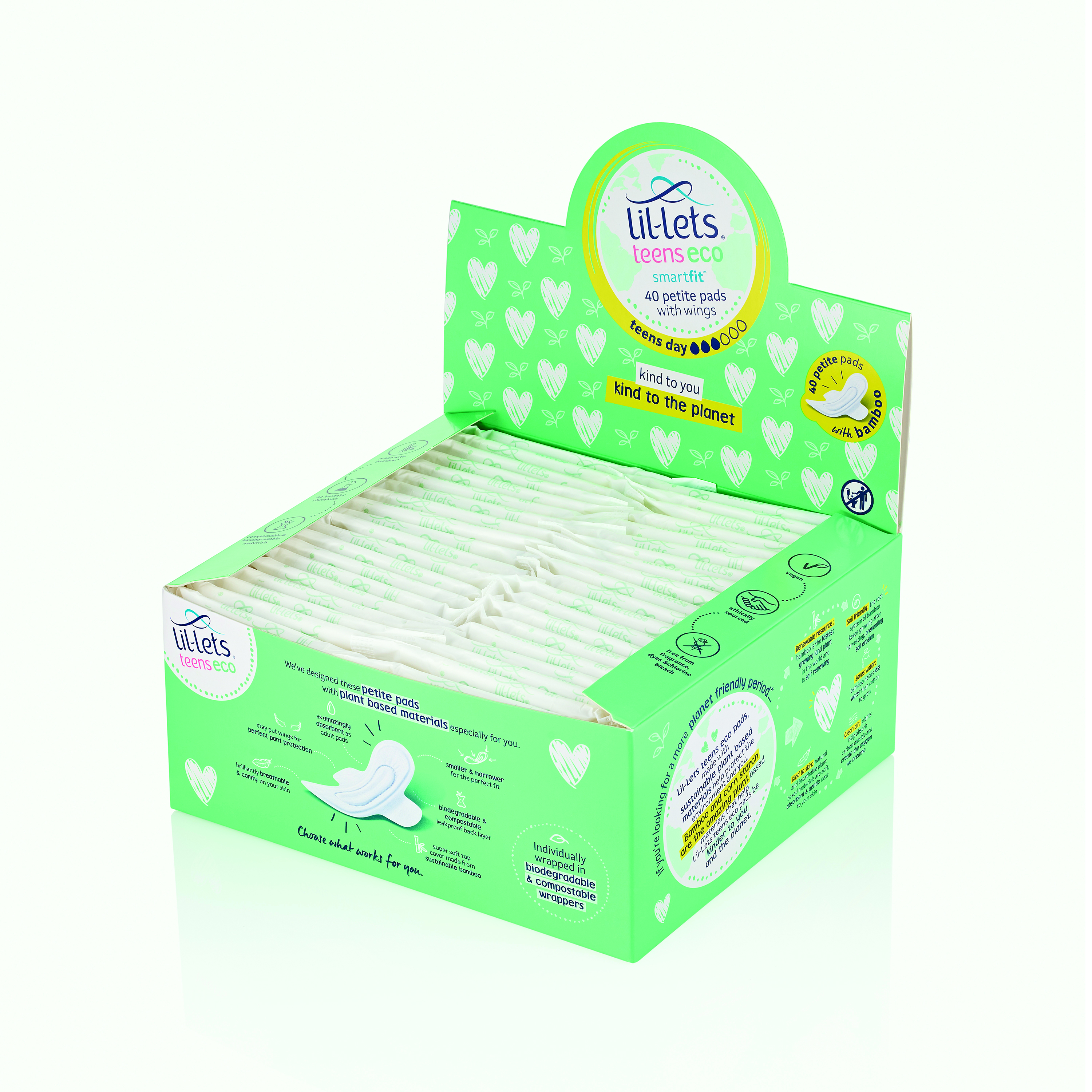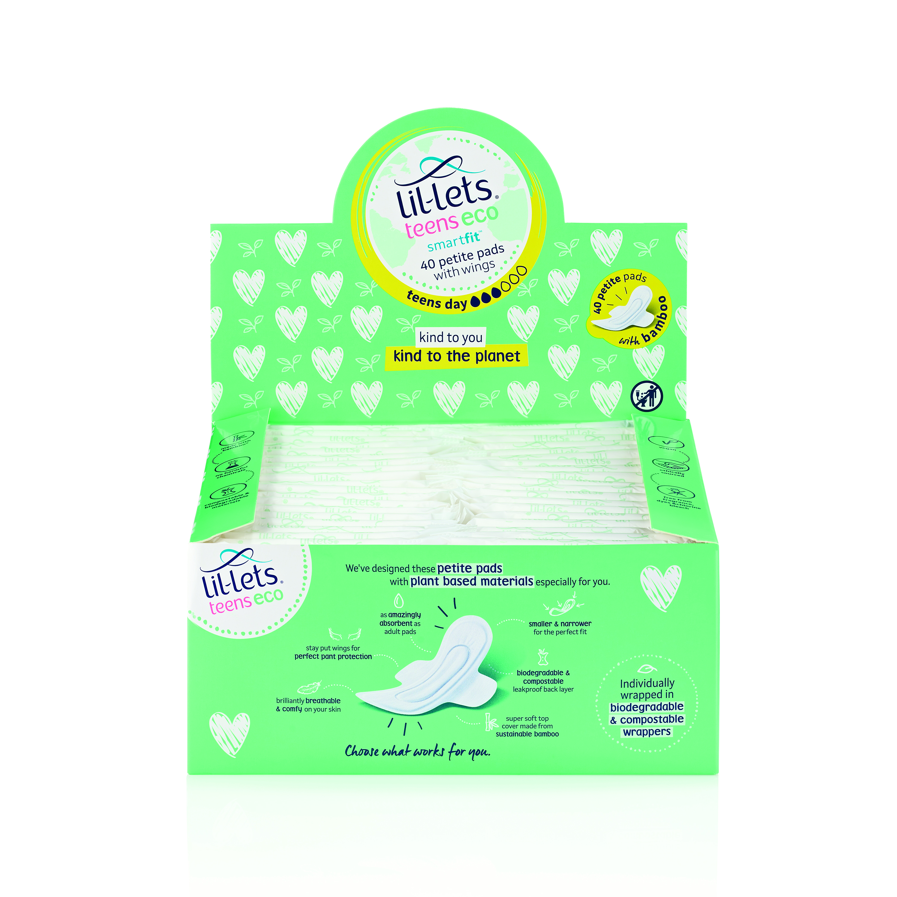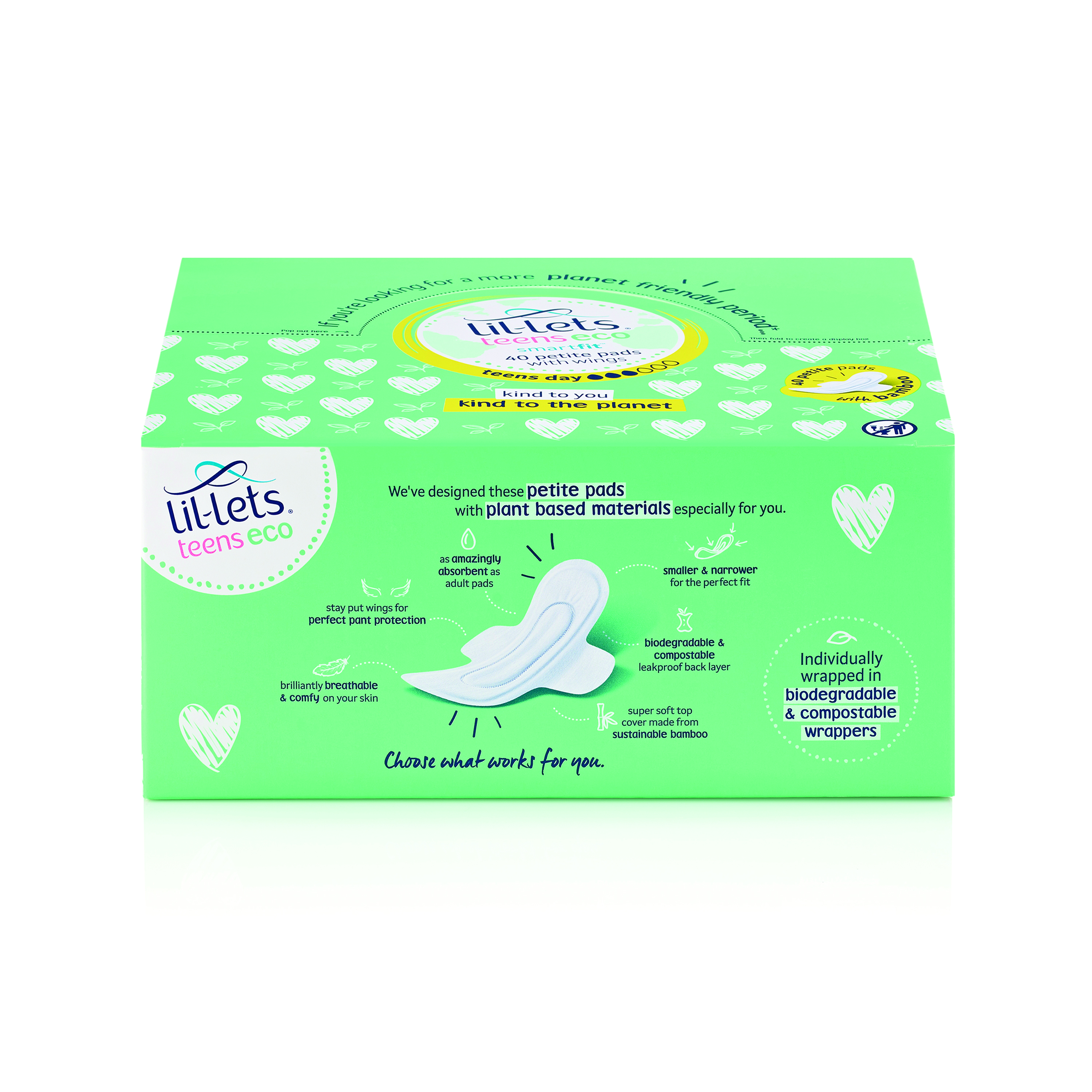Lil-Lets teens eco smartfit 40 petite pads with wings, made with sustainable plant-based materials such as bamboo and corn starch which are plant-based materials make these pads kinder to you and the planet. Smaller and narrower, perfect for younger girls and petite women. The soft top cover is made from bamboo, which is brilliantly breathable and kind to your skin. Fragrance-free, free from chlorine bleach and are vegan and ethically sourced. Each pad is individually wrapped in a biodegradable and compostable wrapper, helping you to have a more planet friendly period.