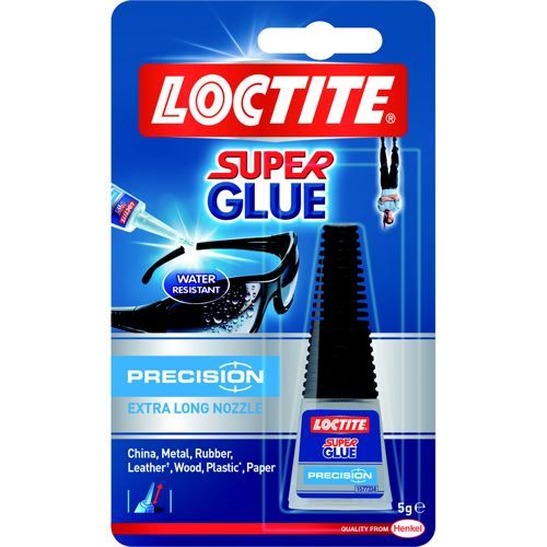 Loctite Precision Super Glue is a multi-purpose glue that provides durable, long lasting and invisible repairs for quick bonding challenges in the workplace. With a transparent finish, it comes with an anti-clog cap and an extra long nozzle to ensure precise applications on hard to reach surfaces. Its powerful liquid and waterproof formula has been developed to form resilient bonds to withstand heavy loads and resist shocks and extreme temperatures. Loctite Precision Super Glue bonds in seconds and gives long lasting durability on a range of materials including rubber, leather wood, metal and most plastics.