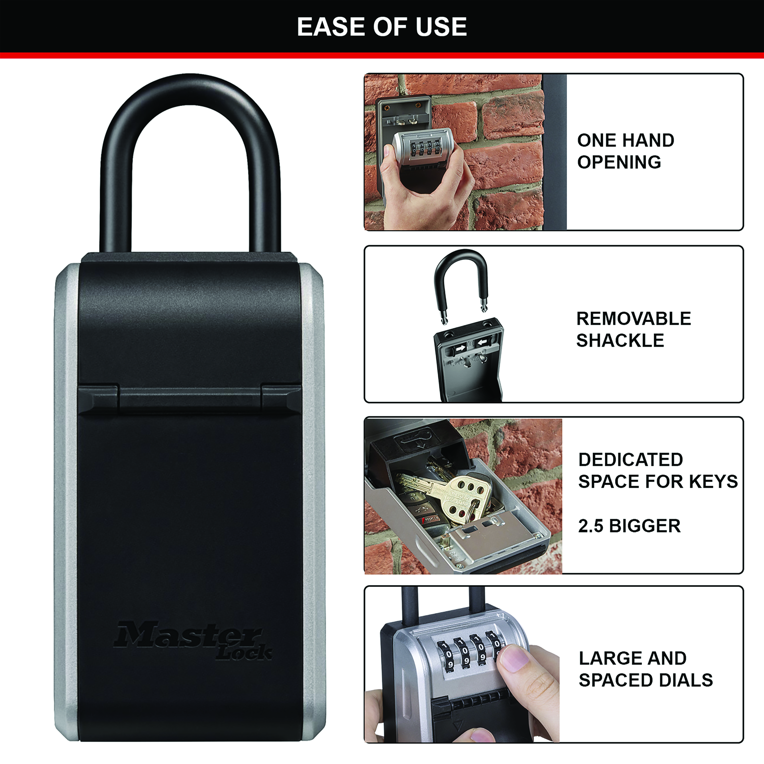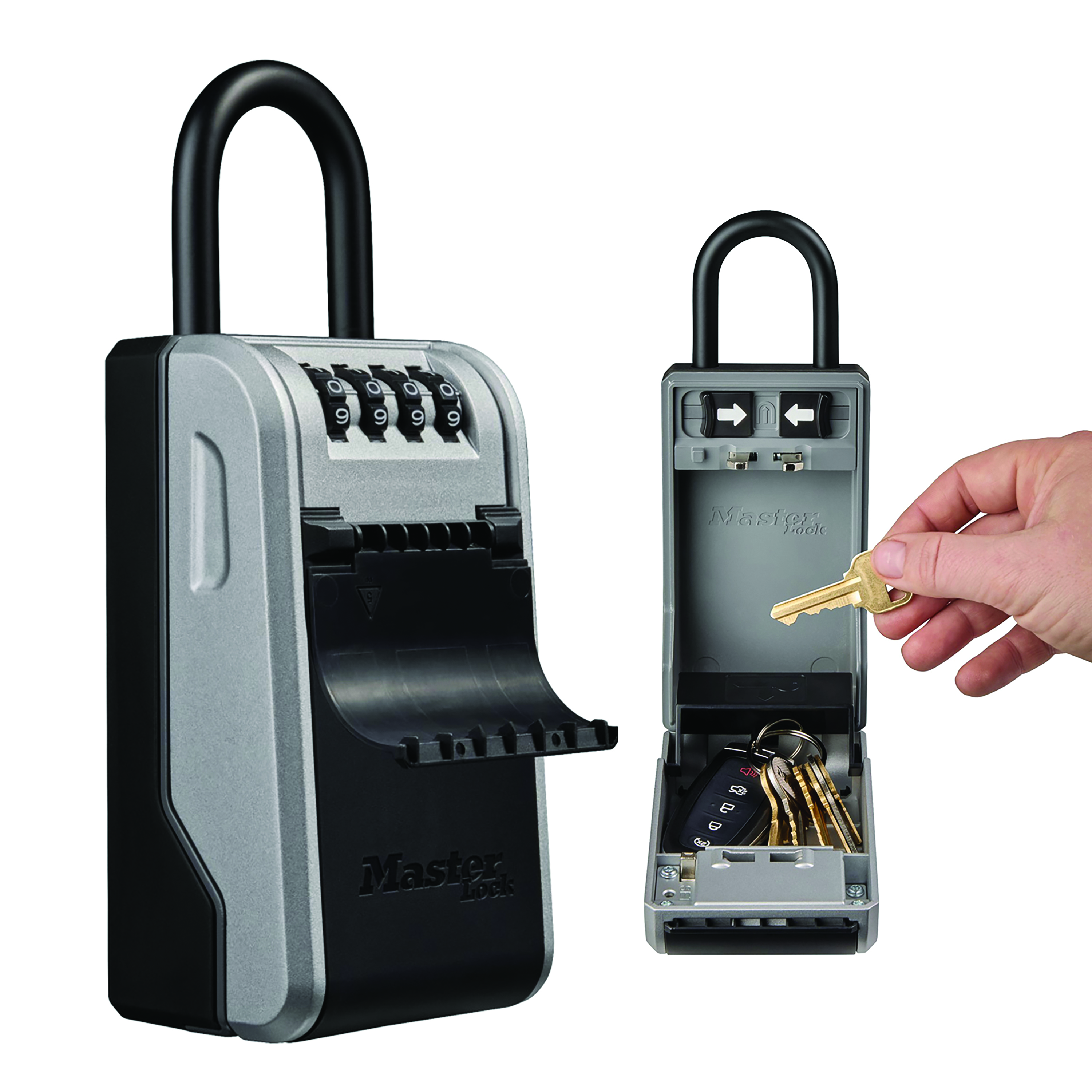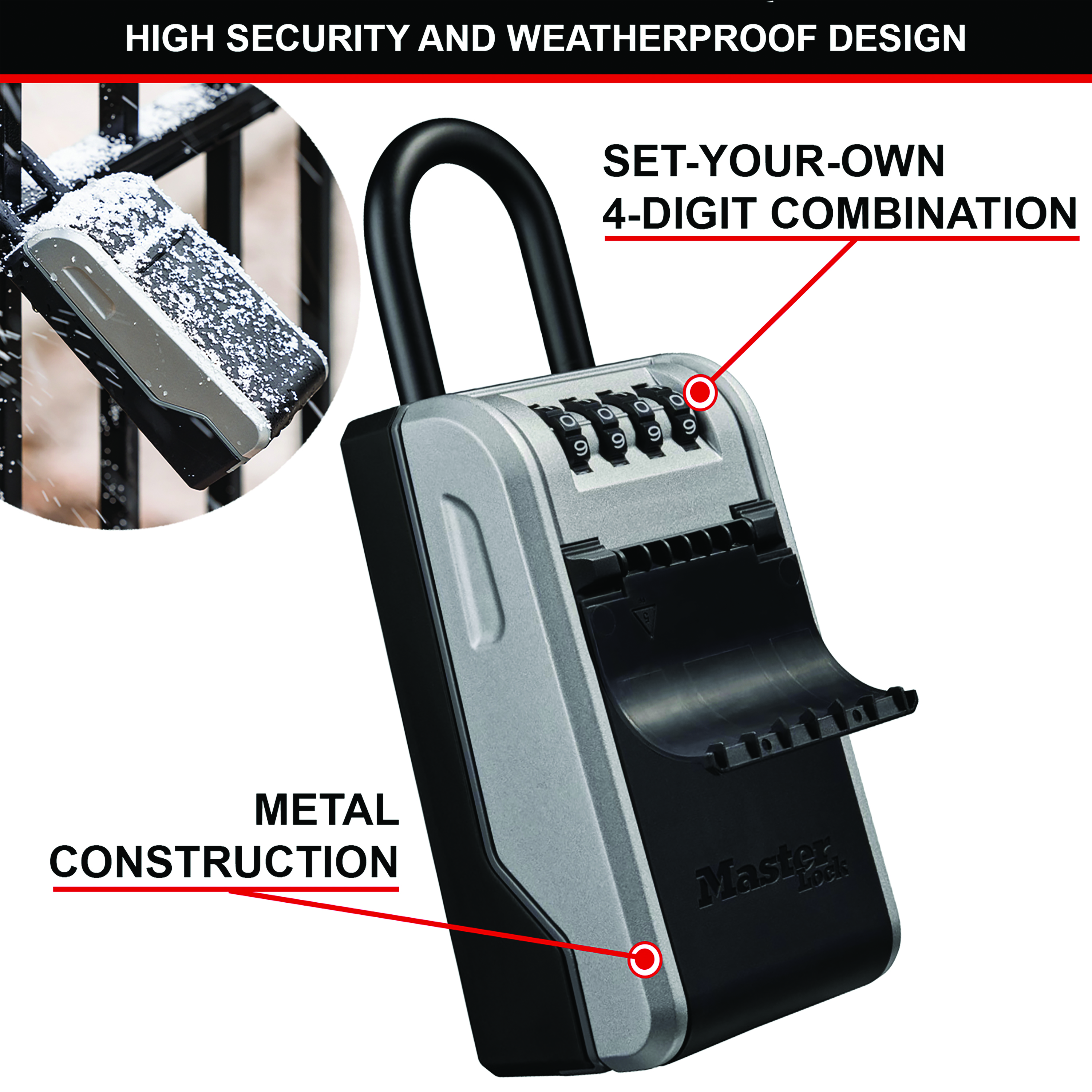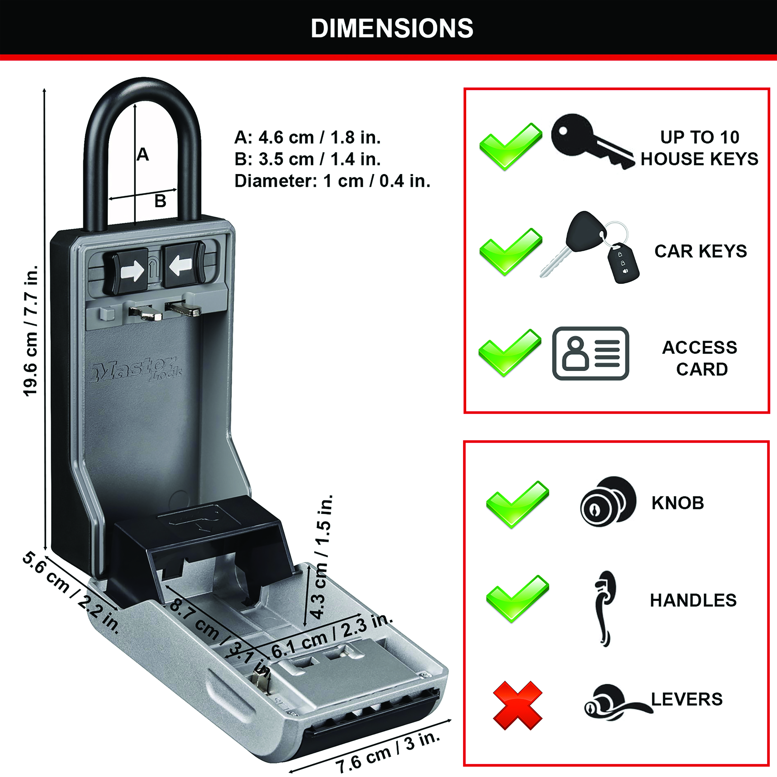 The New Innovative Select Access 5480EURD from Master Lock is the perfect solution to share your keys and access cards with people you trust. This new design features a removable shackle to attach to fixed points and is perfect for portable security or if temporary access is needed across multiple properties. The 5480EURD is a great key safe to share keys with care takers, home workers, family or roommates. It is a great solution for AirBNB, home rental, collective ownership as there is no need to fix it on the wall and it can be attached anywhere such as: door handles, fences, gates, rails and more. Featuring a solid construction with a metal body to resist against different type of attacks. With an 87 x 61 x 43mm storage capacity, it is up to 2.5 times bigger than a standard key safe, storing up to 10 keys (house, car keys and access cards). The 4-digit combination offers up to 10,000 possible codes, giving keyless convenience and increased security. Featuring large, spaced dials which are easy to turn and read, the key lock box offers side handles which pull to open, making it easy to open with just one hand. Complete with a protective cover which protects the combination from weather, dirt and grime, the 5480EURD has a Limited Lifetime Warranty, providing peace of mind from a brand you can trust.