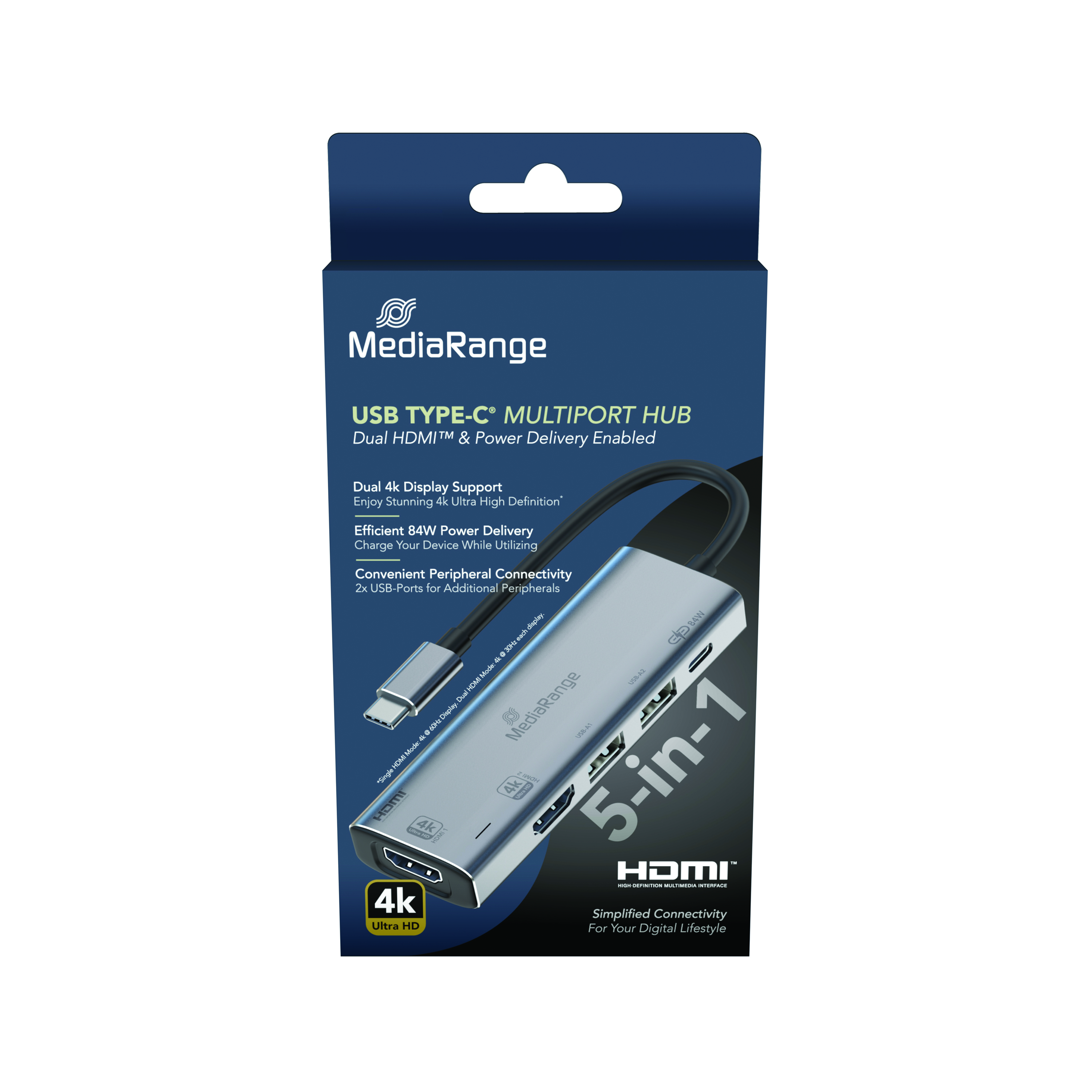 The MediaRange USB Type-C hub with five ports is ideally suited for connecting up to two USB 2.0 devices (e.g. mouse, keyboard, printer, external hard drive) and 2x HDMI monitor with a resolution of up to 3840 x 2160 pixels at 30Hz and a USB-PD Type-C charging slot with a charging power of up to 84 watts. Perfect for expansion and connection to a smartphone, tablet PC, computer or laptop with USB Type-C socket. The hub is bus-powered via the USB port, so there is no additional power supply required.