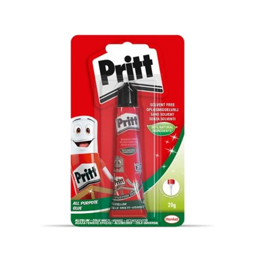 Pritt All purpose glue (adhesive). Squeeze Tube for accurate dispensing. Screw off top for easy resealing. Solvent Free. Washable. 90% natural ingredients. Dries clear / transparent