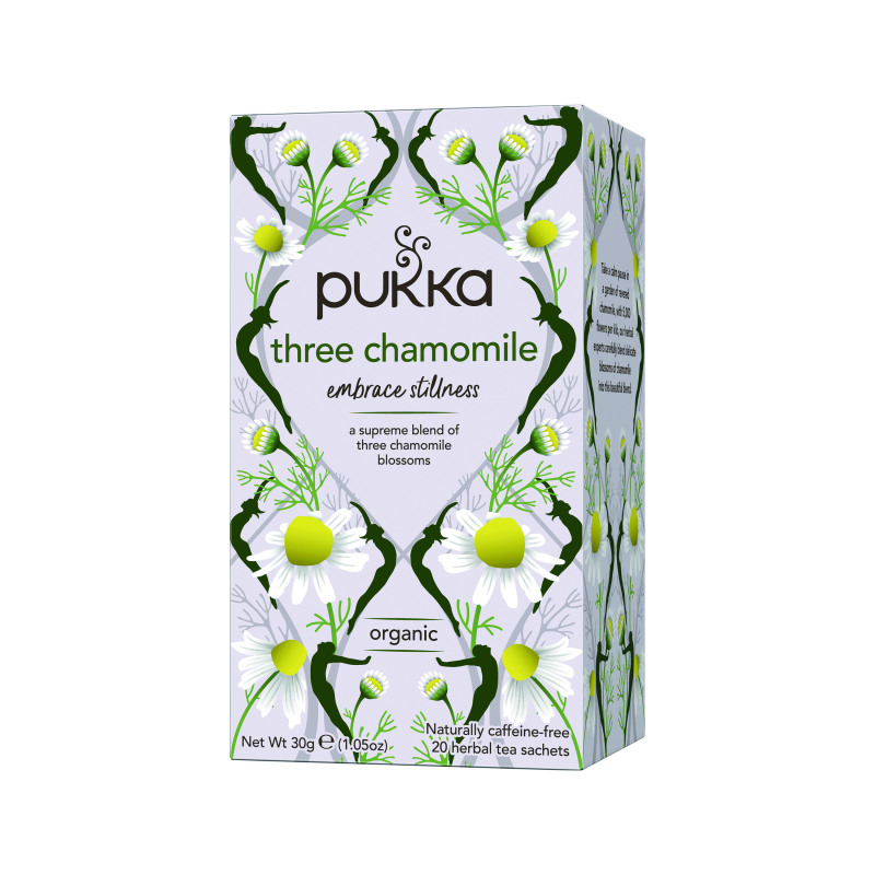 Pukka Three Chamomile Organic tea bags are perfect for a moment of tranquillity. Sourced from three different countries, Egypt, Hungary, and Croatia, each has different climates and weather conditions meaning the delicate flowers take on different flavours and properties. Three Chamomile tea combines the latest scientific research with traditional herbal wisdom to naturally calm you. Each compostable tea bag is full of essential oils and the highest quality organic chamomile, specifically sourced for its harmonising properties. Chamomile is nature's most tranquil herb as its essential oils have a relaxing effect that soothes the body. As you relax into the floral flavour of chamomile feel the tension ease and your inner harmony restored.