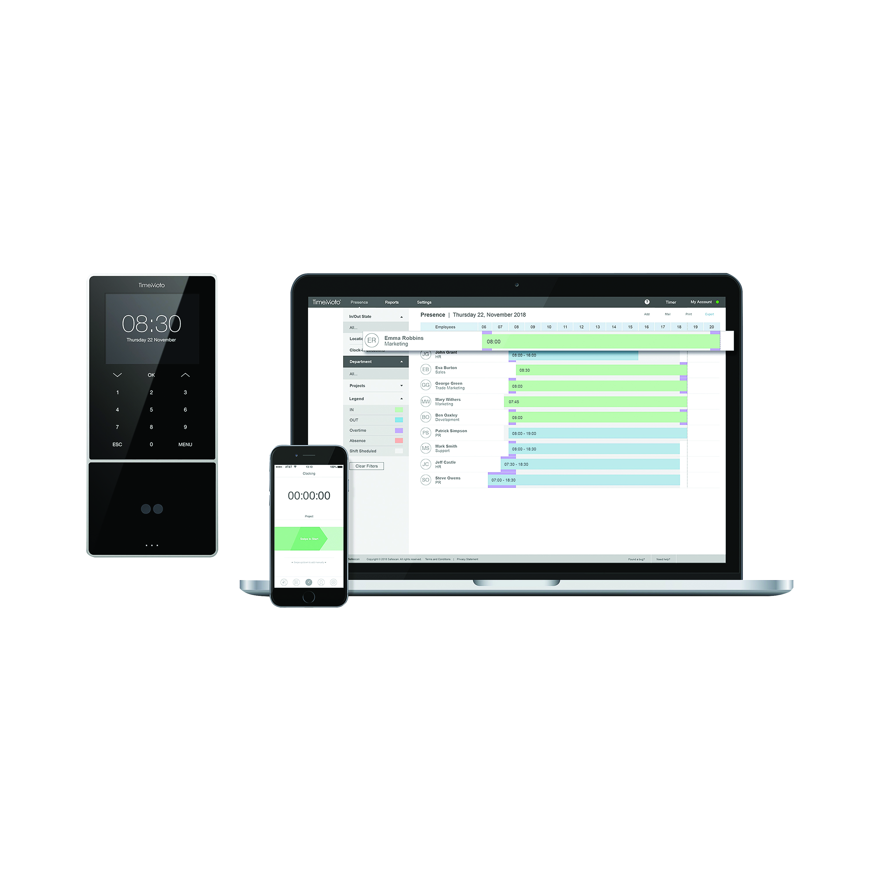 Experience security and convenience with the TM 838 SC. Thanks to the integrated face recognition, MIFARE and DESFire Badges, users can easily and securely register their working hours. In addition, the TM 838 SC can also be used with an RFID Badge or personal PIN code. The TimeMoto TM 838 SC is suitable for up to 2,000 users and 400 face templates and can store up to 100,000 time logs. Perfect for when you want to register and manage work time more efficiently.