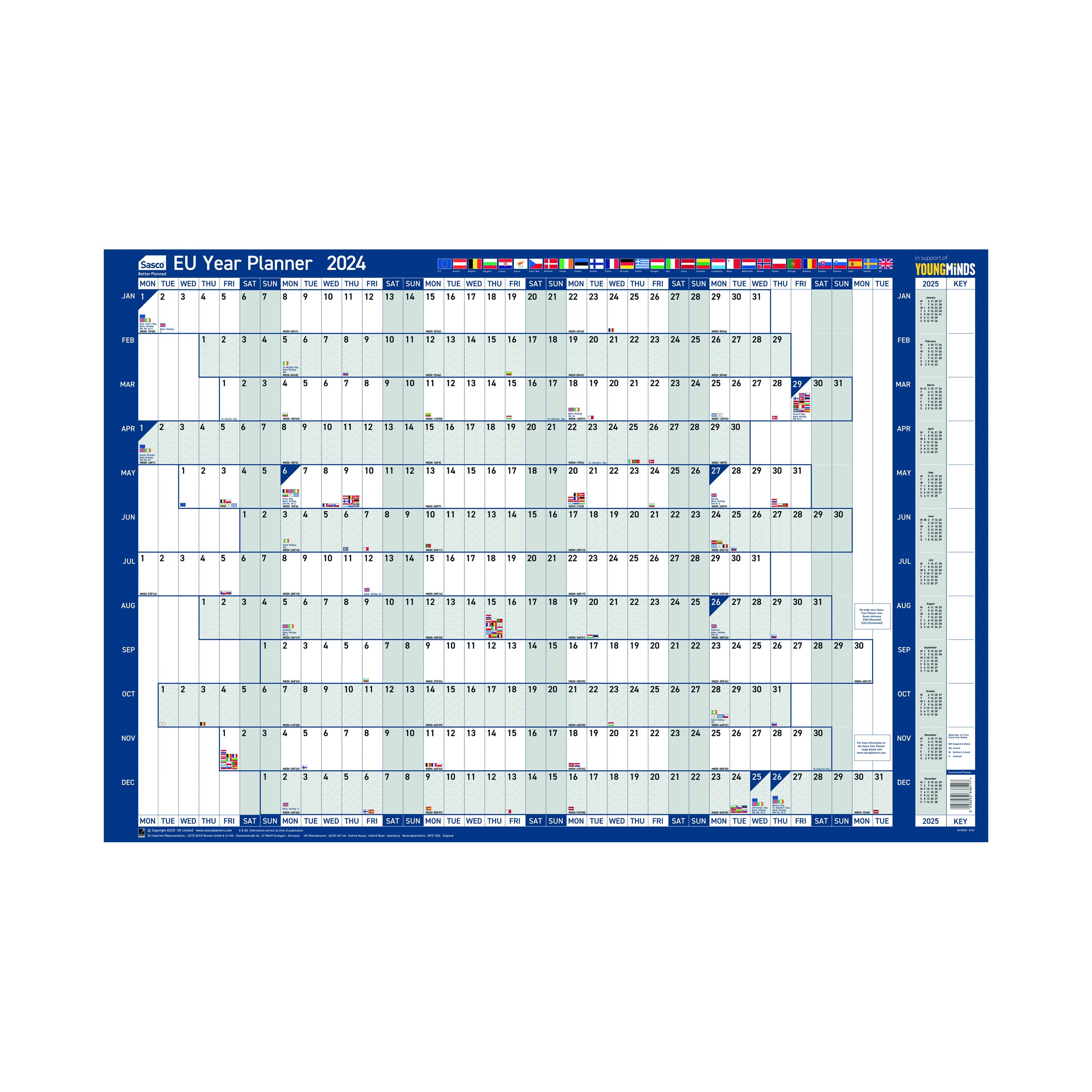 - See all your events and activities from January to December, at a glance, on this EU year planner, ideal for anyone working in a pan-European environment. Includes all the key features of the Sasco Original Year Wall Planner plus all European public holidays