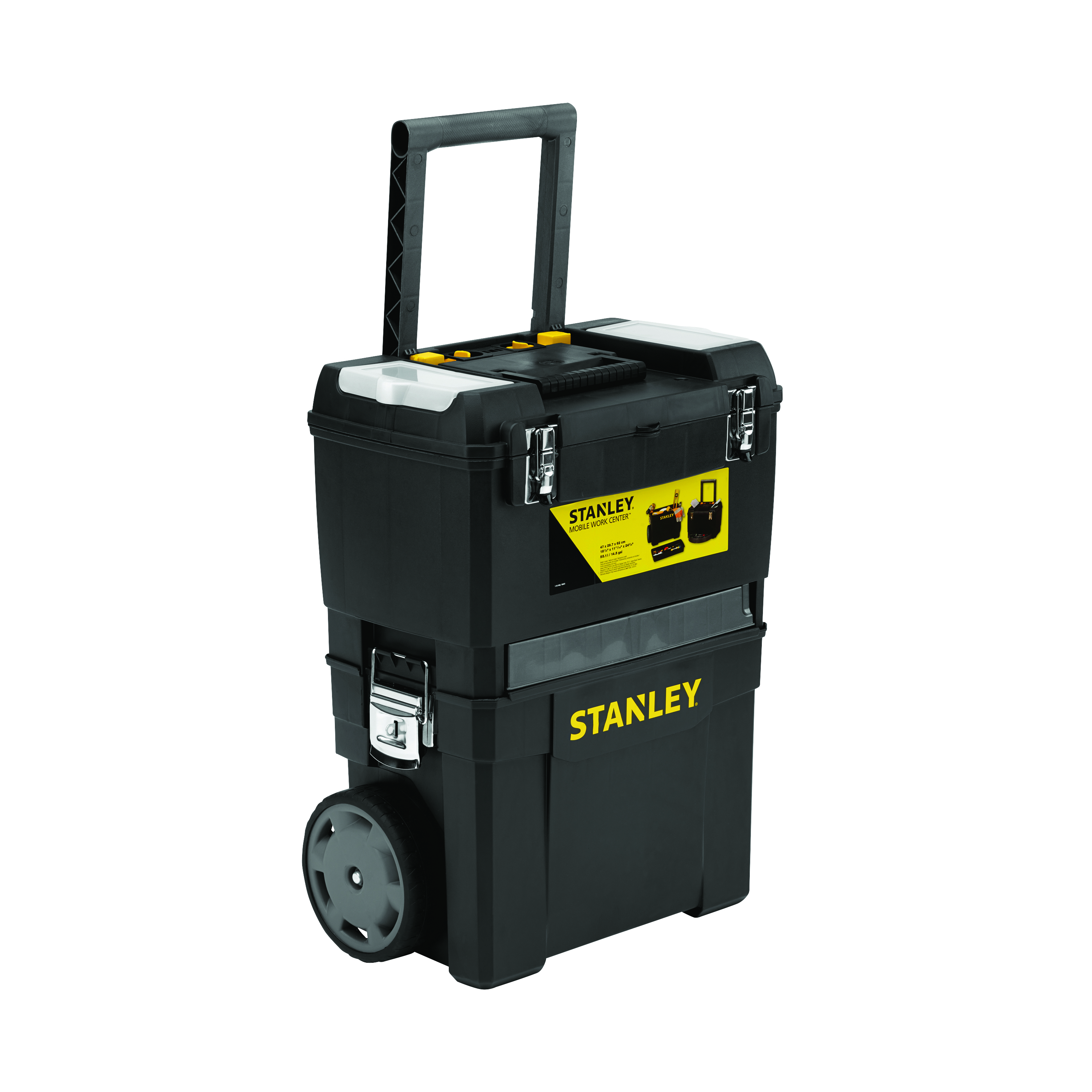Stanley have produced a 2 in 1 mobile work station that separates in seconds into 2 units. The Stanley 193968 has an extra large toolbox with removable tray that maximises volume utility and a giant bin capacity. This Stanley mobile tool chest has many features in store and gives the user a top quality all round winner in tool storage with its swivel front drawer (carousel) and lid organizers for small parts, large trucking wheels for rough on site conditions, new one piece strong plastic handle, all weather nickel plated toolbox and side latches and with a load capacity of 88lbs you get a good array of tools at your side.