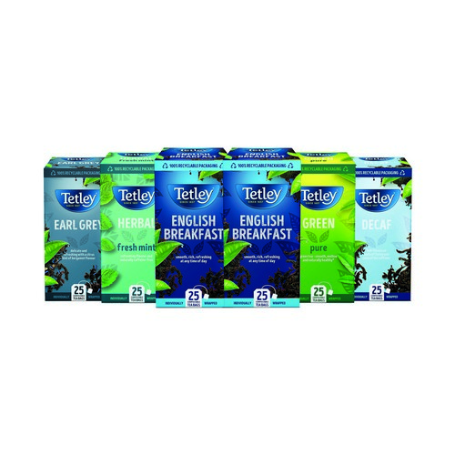 Tetley variety best seller pack, with 5 of Tetley's very best selling flavours in one convenient mixed case. Teabags are string and tag envelopes. Pack contains 6 boxes each containing 25 string and tag teabags. Case of 6 boxes of tea contains: single box of each: Green, Decaffienated, Fresh Mint, Earl grey and 2 boxes of English breakfast.