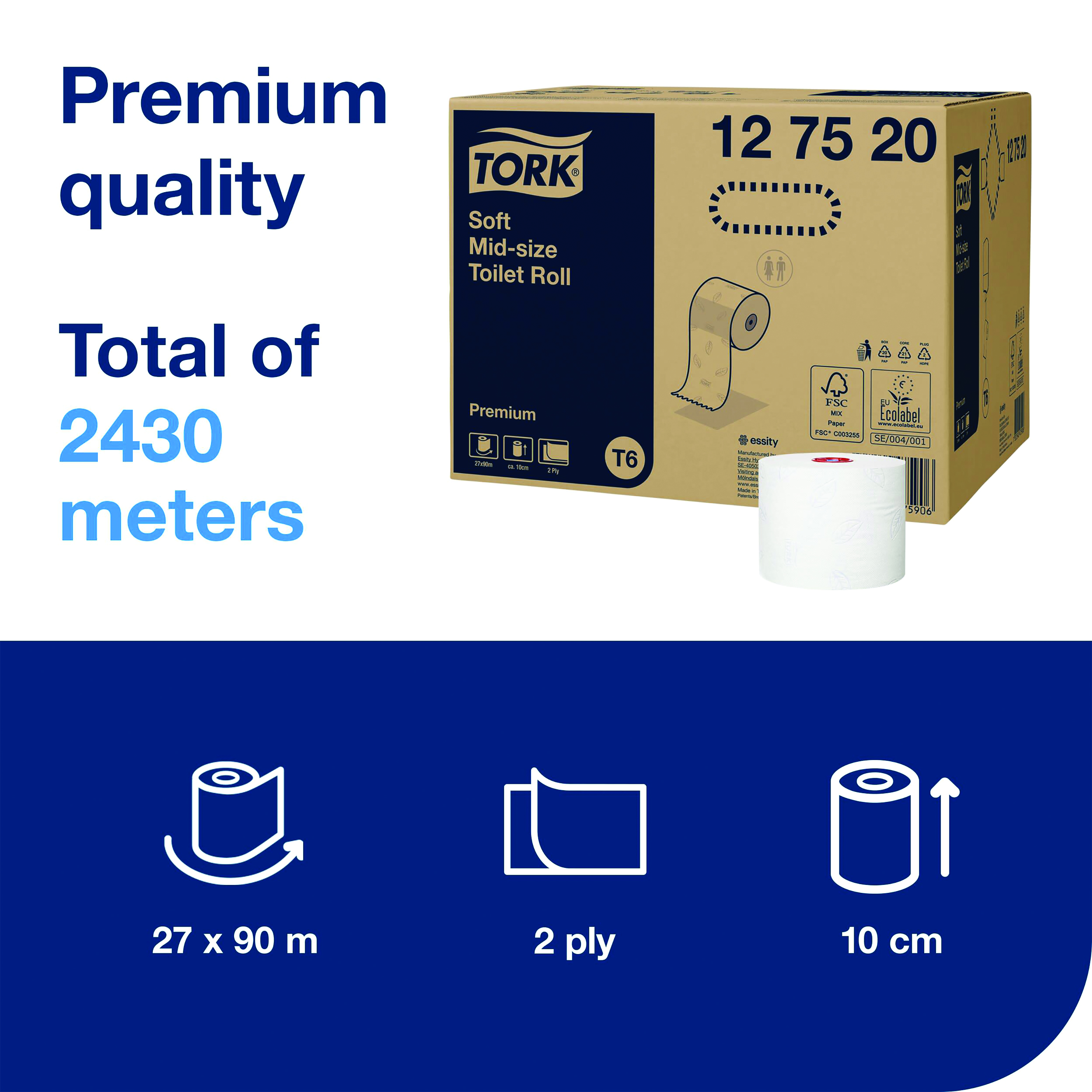 These soft toilet rolls are designed for use with the Tork Twin Mid-Size Toilet Roll Dispenser to create a hygienic and cost effective washroom solution. Each roll has 90 metres of extra soft, 2-ply paper for premium performance and absorbency combined with a superior look and feel. Ideal for low to medium traffic washrooms, in dispensers, these high capacity rolls hold the equivalent of four to five standard rolls. This pack contains 27 rolls for long lasting use.