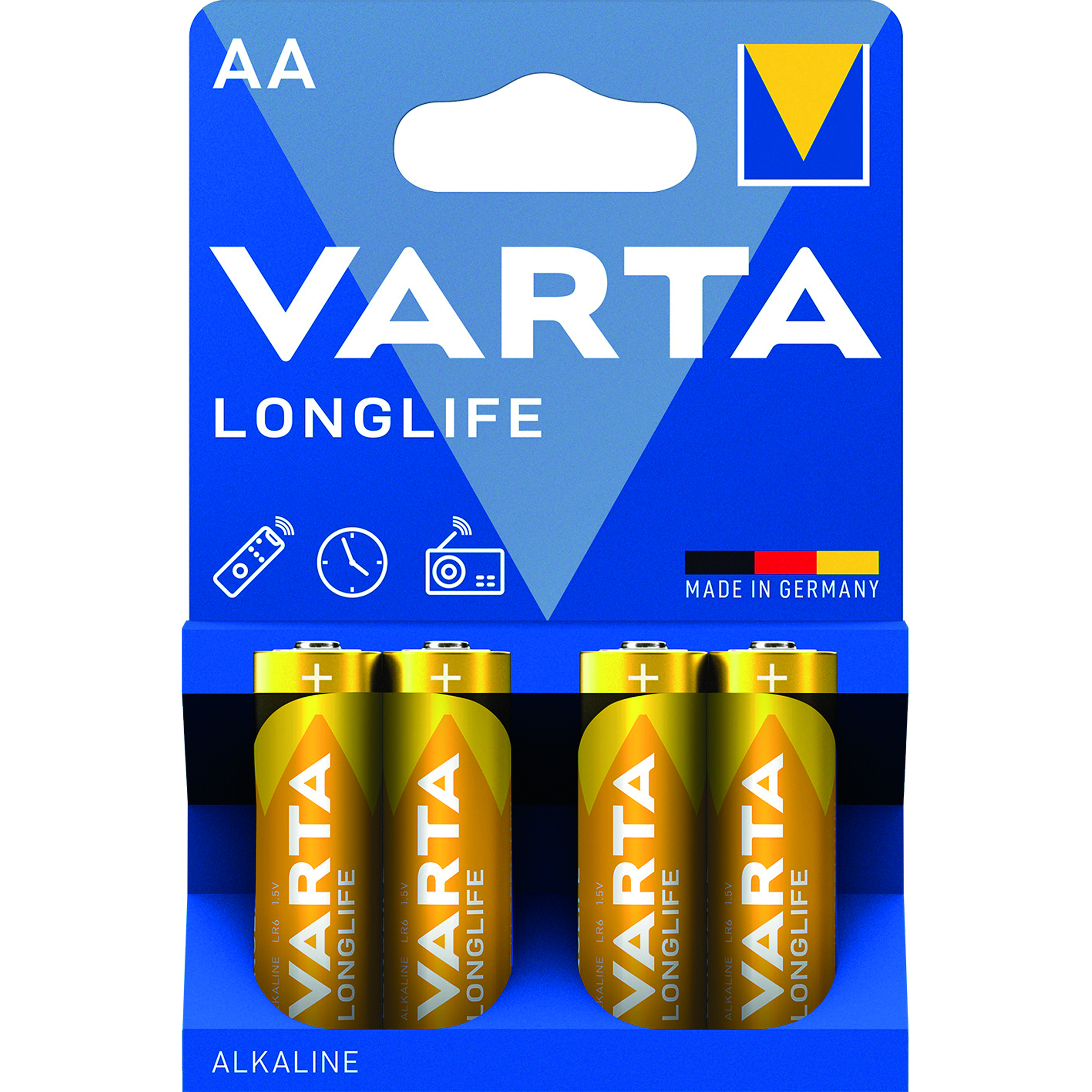 Varta Longlife is a long lasting battery for low drain devices. Suitable for remote controls for televisions and music systems, wall clocks and radios, it offers long lasting energy with constant and low energy consumption. With guaranteed storage time of 10 years, this battery blister pack contains four batteries and provides clear communication of usage with pictograms on the pack. Designed with a 'single press out', the pack enables easy opening and stores unused batteries.