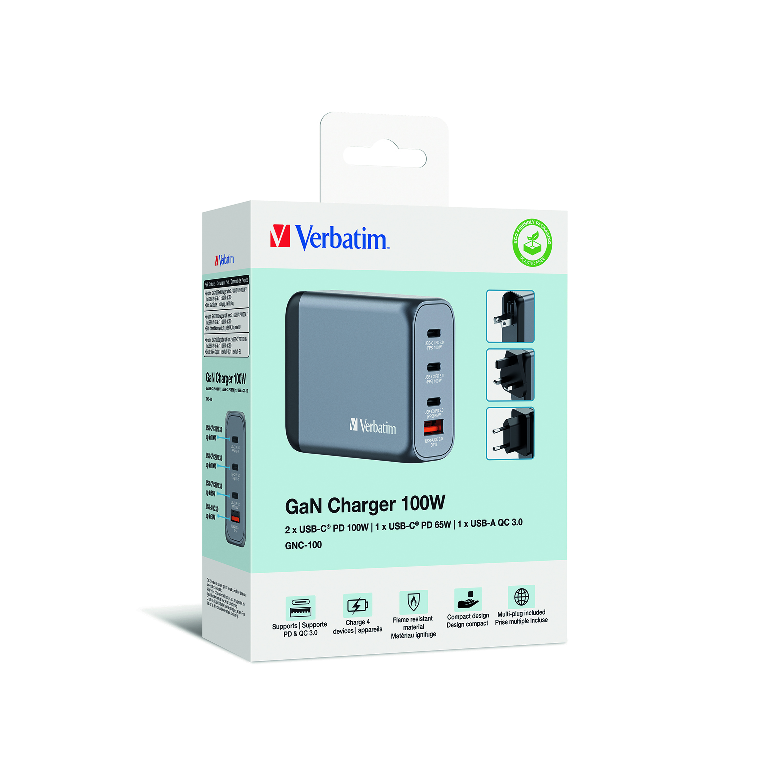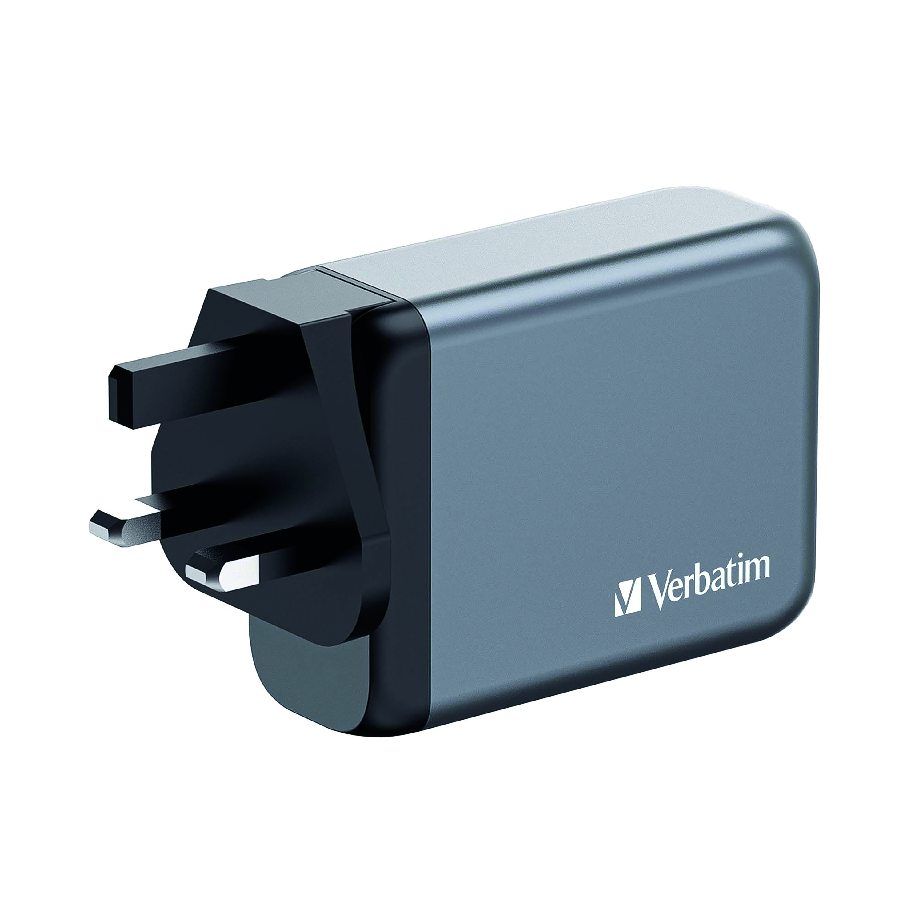 Verbatim's 100W GaN Wall Charger consolidates multiple chargers into one, combining two USB-C PD 100W ports, one USB-C PD 65W port and one USB-A QC 3.0 (EU/UK/US) port in a sleek, palm sized design. Ideal for the office, home or travelling to power your laptop, tablet, smartphone, gaming devices, and more. With its foldable US prongs and replaceable EU and UK plugs, it's the ultimate travel companion. Galliam Nitride (GaN) technology delivers high-powered, fast, efficient charging, and generates less heat. GaN chargers are smaller and lighter than traditional silicon-based chargers, making them ultra-portable and ideal for travel.