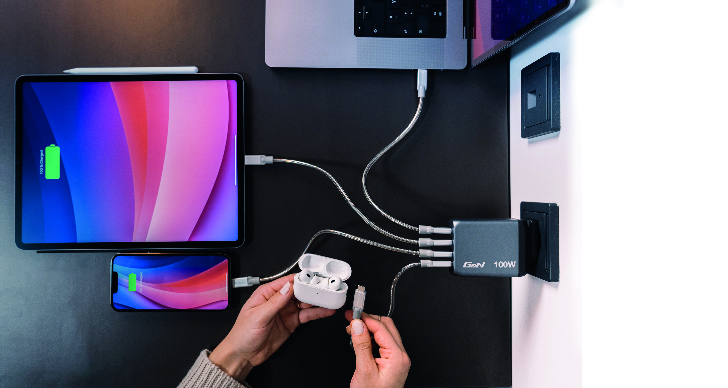 - Supports charging of up to 4 devices simultaneously with a maximum total output of 100W