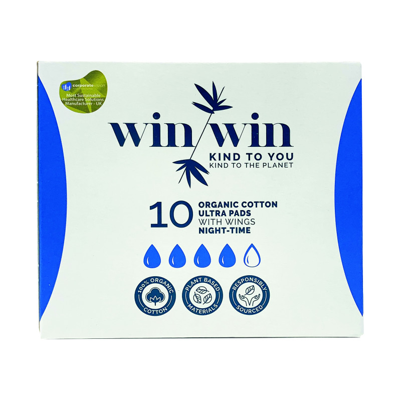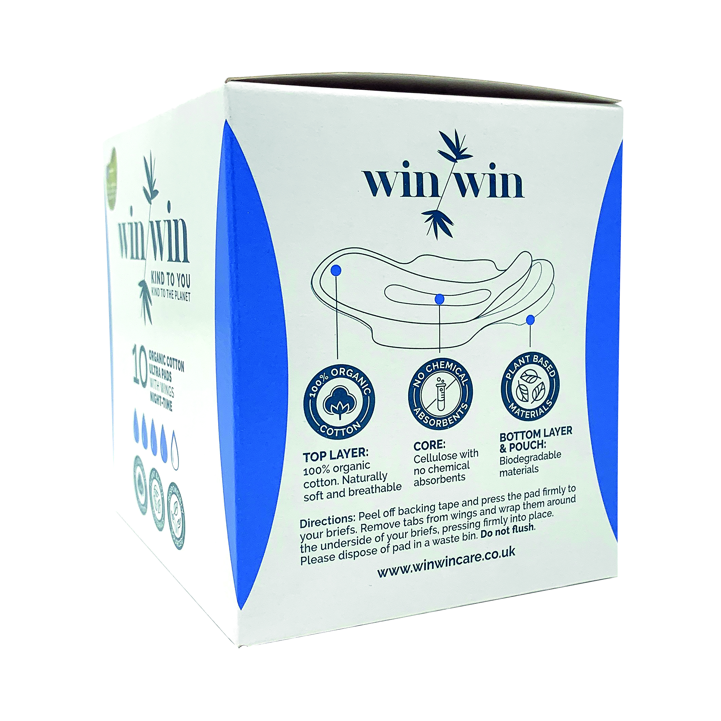 There is no need to compromise between great performance and protecting our planet. That's why plant-based and biodegradable materials are transformed into high quality period care products which provide your body, and the planet, with the kindness they deserve. Disposable period care products often contain chemical absorbents and non-renewable plastics. The truth is, they don't actually need to give great performance! Win Win products absorb just as much as the leading brands. The benefits of organic cotton is reduced exposure to allergens and chemical, it is non-orritant, keeping even the most sensitive skin safe. Grown using natural methods, not chemical-based fertilisers, also emits up to 46% less greenhouse gas than non-organic cotton.